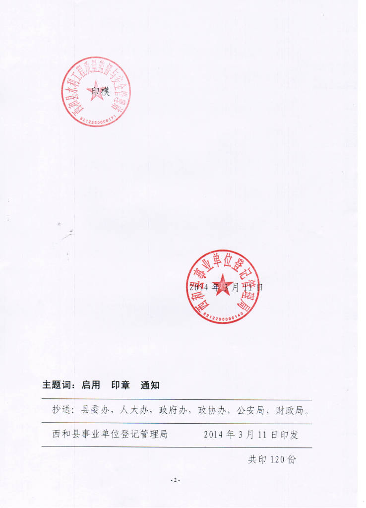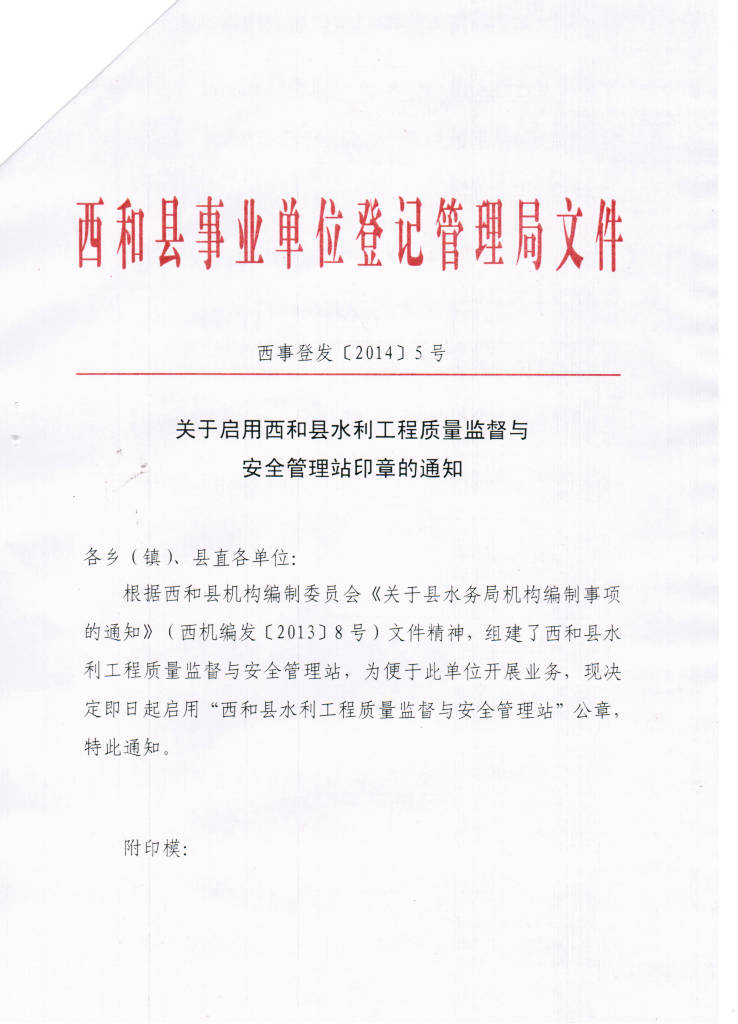 关于启用西和县水利工程质量监督与安全管理站印章的通知